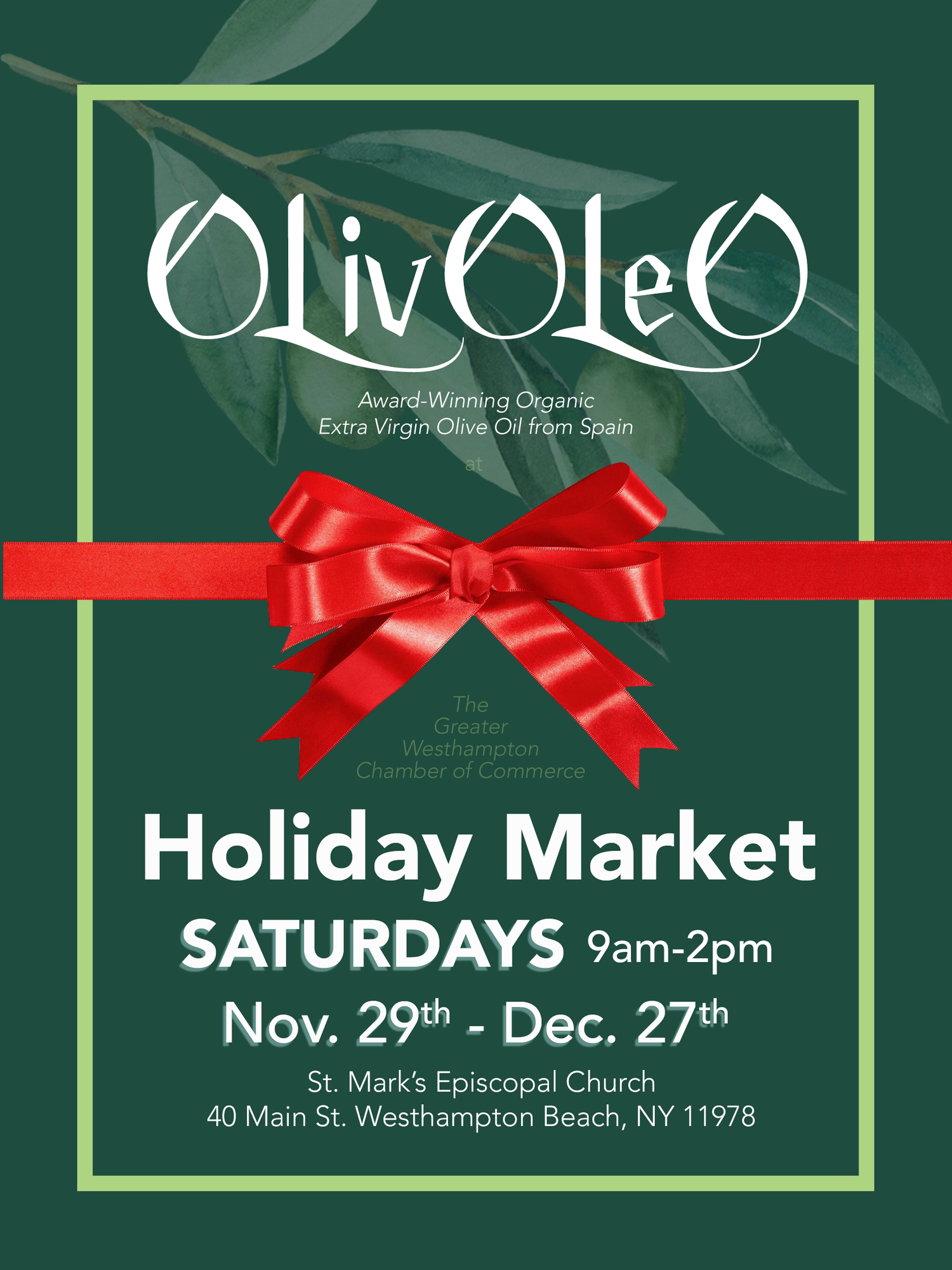 Join OLIVOLEO indoors for in-person extra virgin olive oil tastings this holiday season every Saturday from Thanksgiving to the New Year in Westhampton Beach, NY.