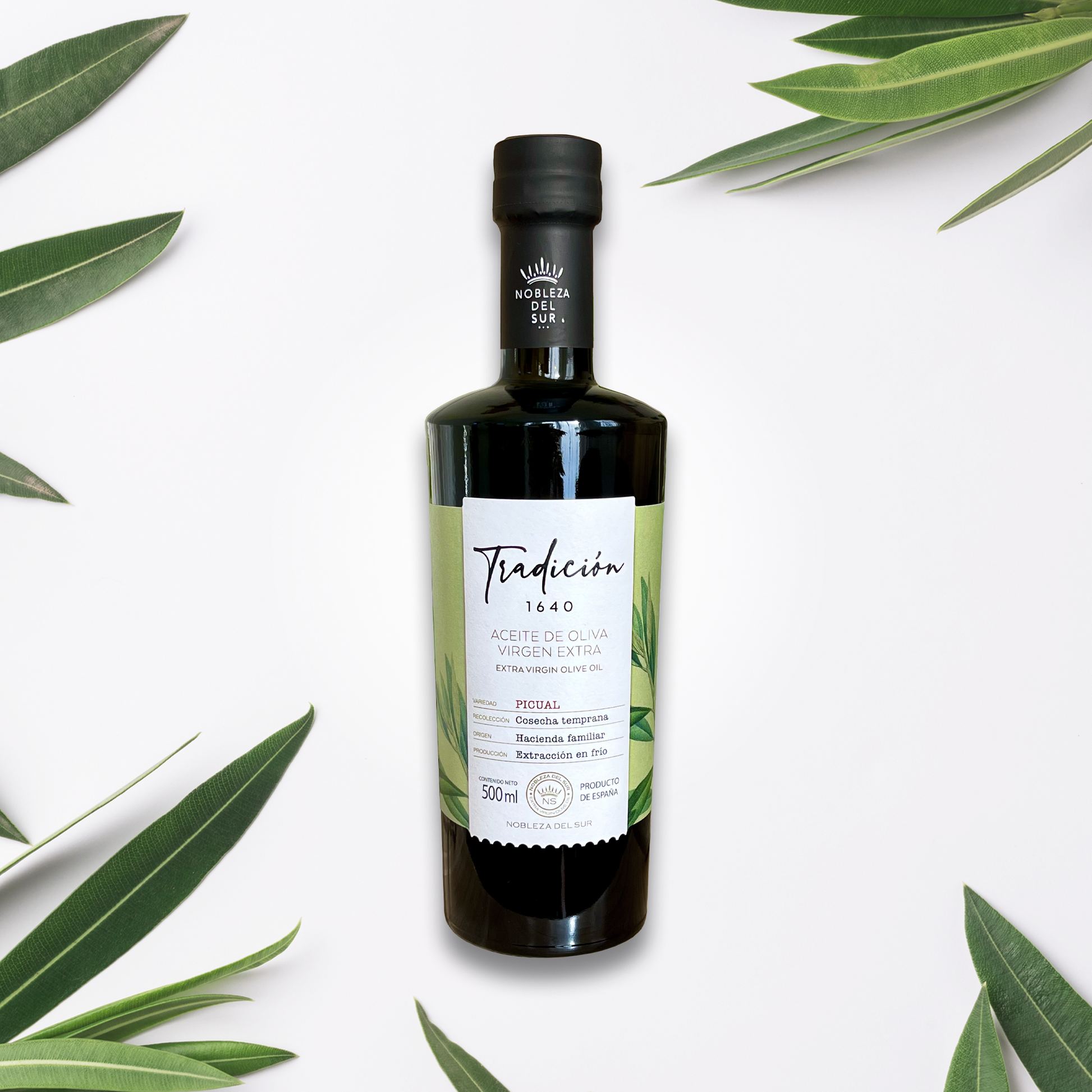 TRADICIÓN 1640 is a single-origin medium intensity early harvest extra virgin olive oil produced by Nobleza del Sur in Vista Alegre from green Picual olives. It has notable floral aromas of olive leaf, grass, and banana, plus fruity flavors of tomato and green herbs that give a sweet entry, slight bitterness, and with a moderate spicy finish. It pairs well with bitter green salads, red meat, ages cheeses, roasted vegetables, and soups. Suitable for cooking and finishing dishes.
