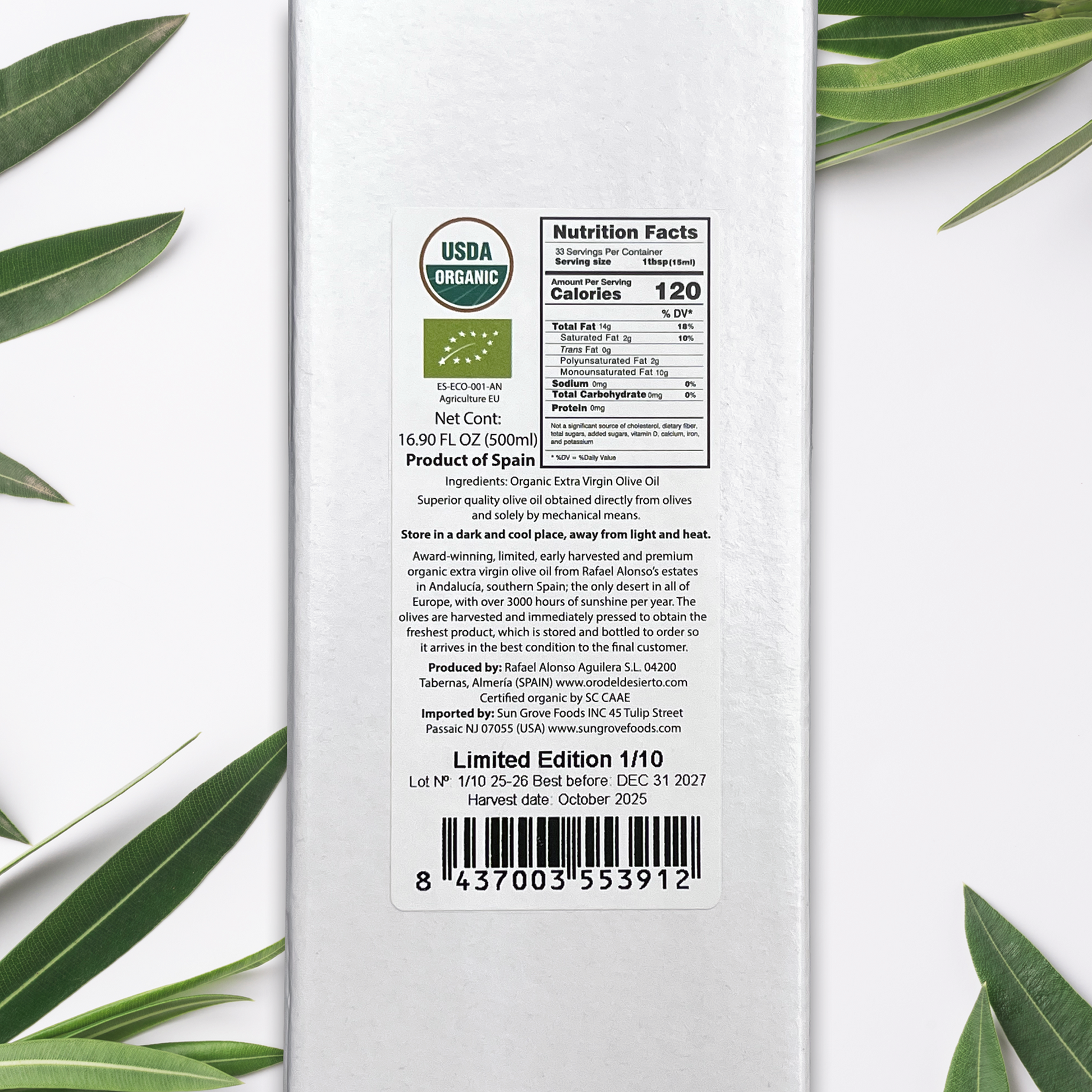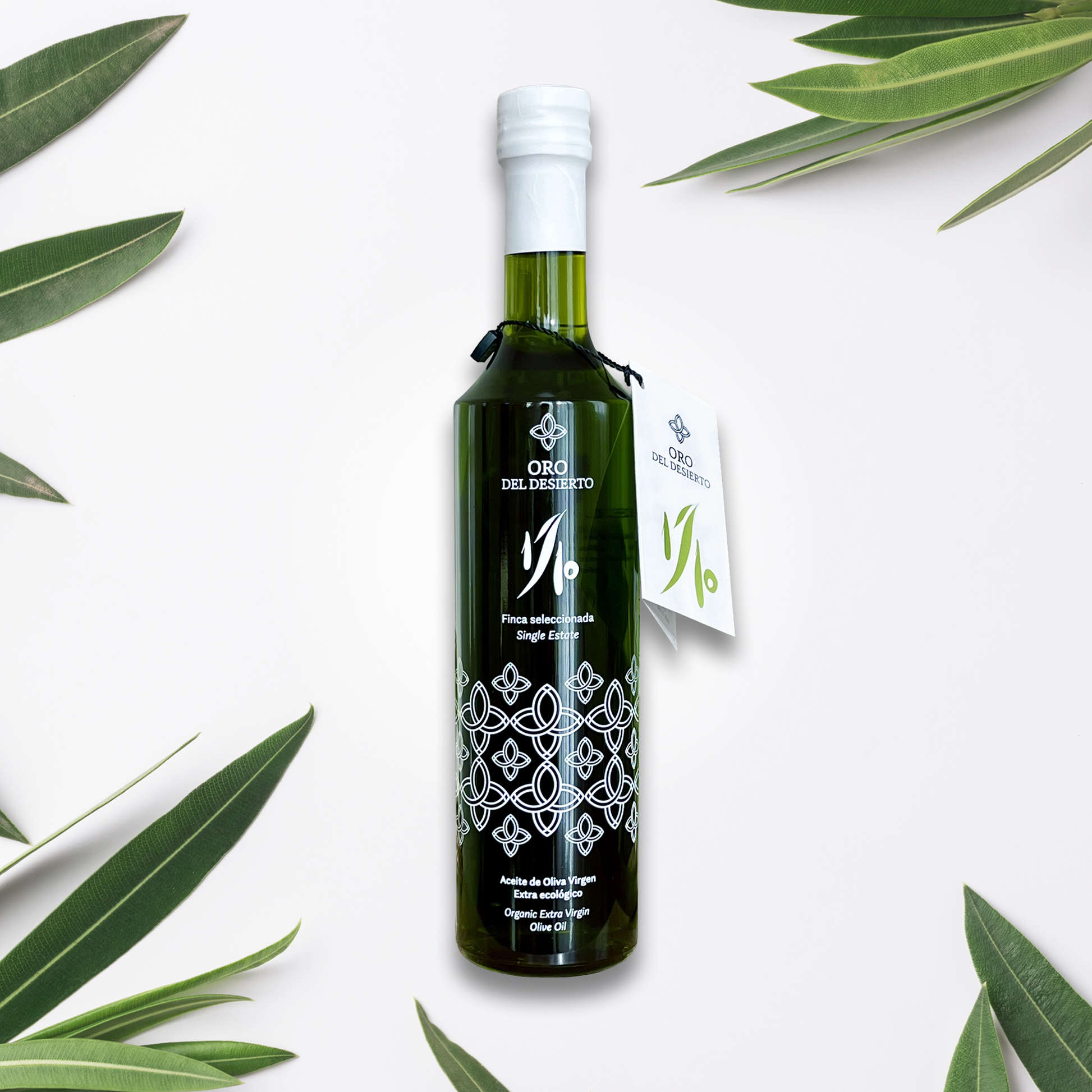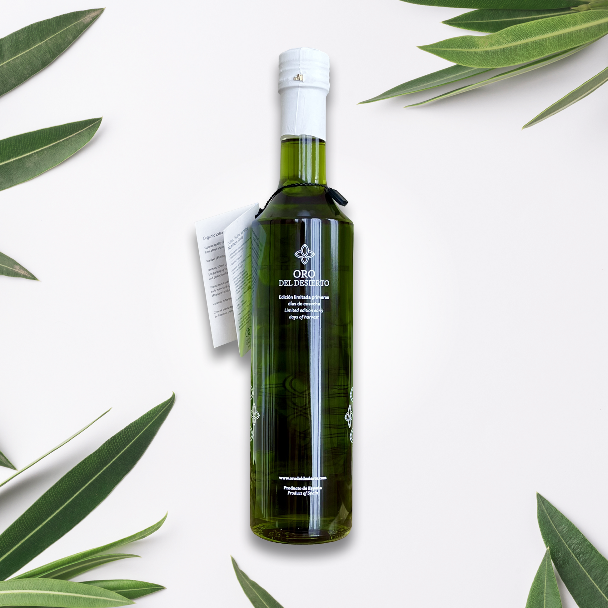 ORO DEL DESIERTO ORGANIC NOVELLO 1/10 is a single-origin limited edition, extreme intensity organic extra virgin olive oil with a very high polyphenol count produced by Oro del Desierto from Picual and Arbequina olives of Finca el Vicario in Almería, Spain. This filtered seasonal Novello oil is the product of the first olive harvest of the year, made from fresh green organic olives bottled just days after milling has notable aromas of green grass, tomatoes, apple, and almonds. Its spicy and bitter flavor is well balanced and pairs well with fresh goat cheese, green salads, sauces, tomato and garlic salads, and fresh or toasted breads. Suitable for dressing and finishing dishes.